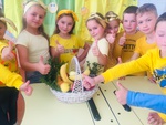 А далі учасників вечірки чекали бананові розваги. І які тільки завдання не довелося виконувати малятам! Із зав'язаними вони шукали в корзині із муляжами овочів і фруктів банани, прикрашали бананове дерево , формували фруктові композиції, змагалися у батлі "Танець банана".